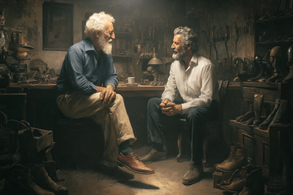 O dia ainda estava longe de amanhecer quando entrei na oficina do Loureiro. O encontrei confeccionando uma linda bolsa de couro grená, com a mesma mestria com que costurava ideias. Fui recebido com um sorriso sincero e um abraço apertado. O elegante sapateiro vestia uma camisa de linho azul claro, com as mangas dobradas até os cotovelos para não atrapalharem o serviço, e uma calça caqui de fina alfaiataria. Os sapatos de couro eram de fabricação própria. A barba branca era curta e bem aparada, ao avesso dos cabelos fartos que, embora também brancos, estavam rebeldes e despenteados. Sem demora, ele preparou um bule de café fresco e colocou duas canecas sobre o pesado balcão de madeira. A conversa fluiu com a naturalidade habitual de dois amigos que emendam assuntos como se fossem trechos de estradas sem fim.